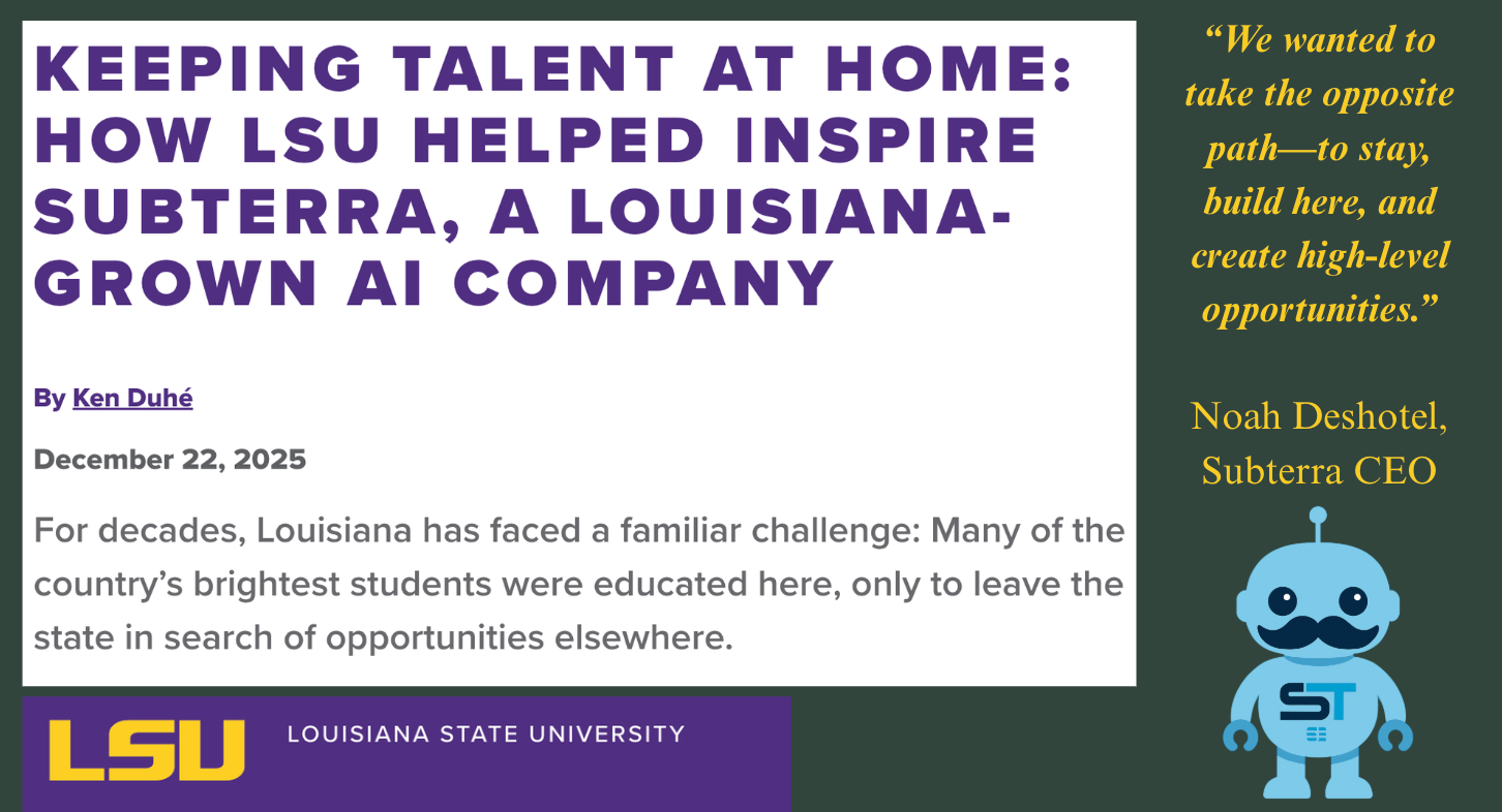Subterra’s work has also caught the attention of Louisiana State University, which recently published an in-depth feature titled “Keeping Talent at Home: How LSU Helped Inspire Subterra, a Louisiana-Grown AI Company.”