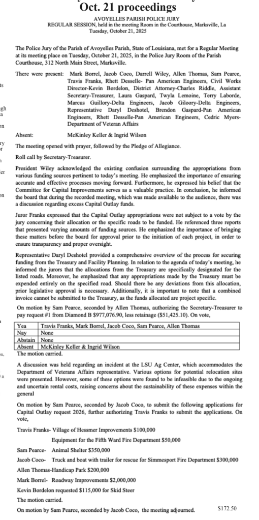Avoyelles Parish Police Jury Oct. 21 proceedings