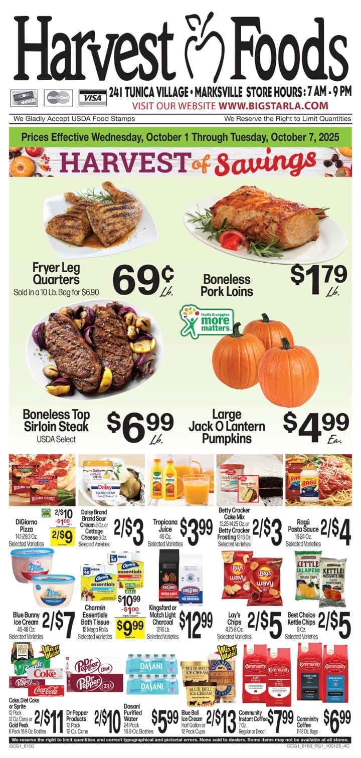 Harvests Foods: Harvest Foods 241 TRunica Village, Marksville Store Hours: 7am-9pm October 1st-7th, 2025