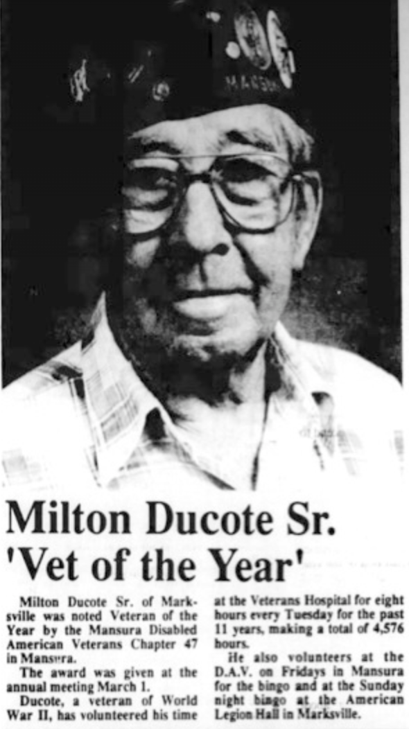 In addition to his hospital work, Ducote remained active locally, volunteering at the D.A.V. in Mansura on Fridays and assisting with bingo events at both the VFW and the American Legion Hall in Marksville.