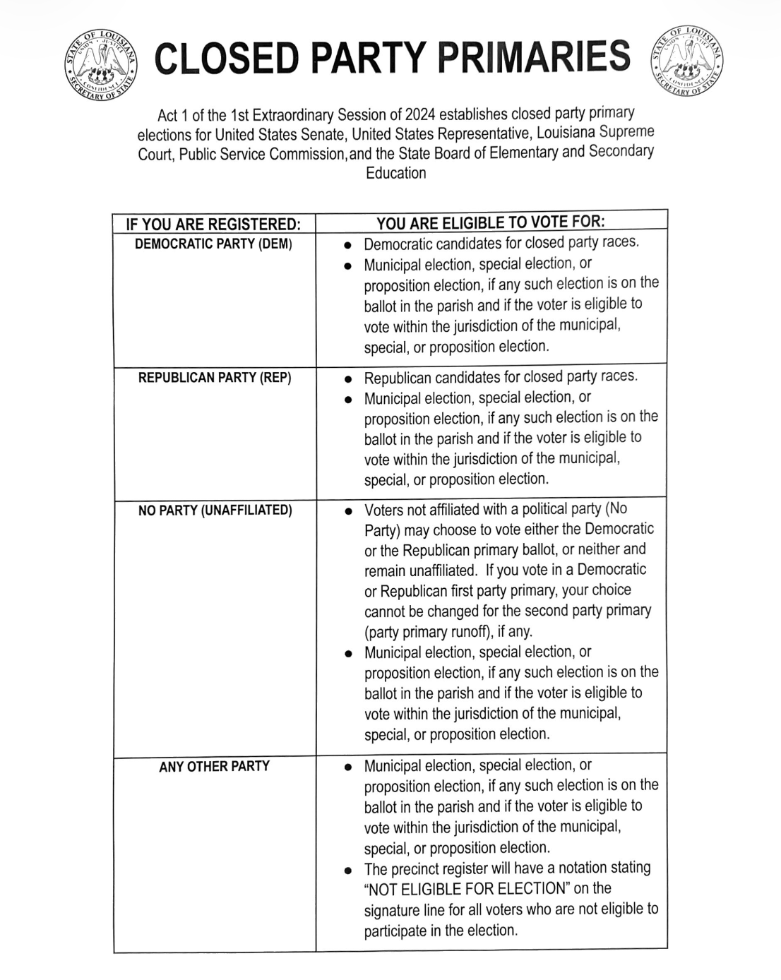 It is important to note that voters registered as “No Party” will still be able to vote on constitutional amendments, the Parish Home Rule Charter, and other ballot propositions that are not part of a closed-party primary. However, No Party voters will not be able to vote for individual Republican or Democrat candidates in a closed-party primary unless they complete the required affidavit at the polling place selecting which party’s ballot they wish to vote.