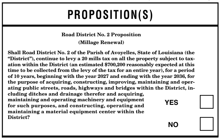 The Louisiana Secretary of State’s Office has certified one item on the ballot, asking voters whether to continue a 20-mill property tax on all taxable property within the district for another 10-year period, beginning in 2027 and ending in 2036.