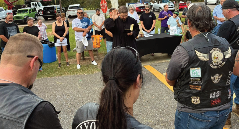 “A priest offers a blessing to riders during the Blessing of the Bikes and Poker Run, a beloved